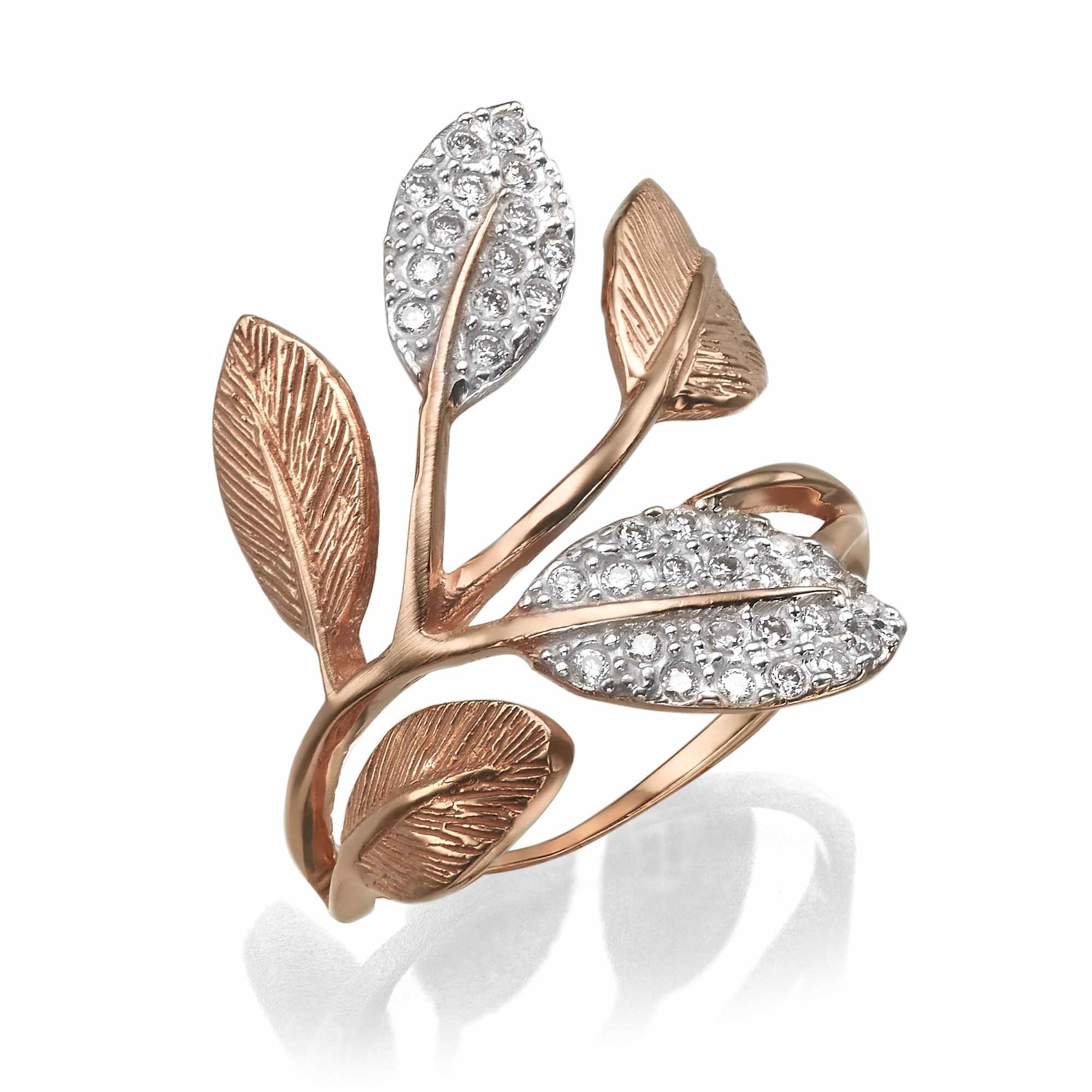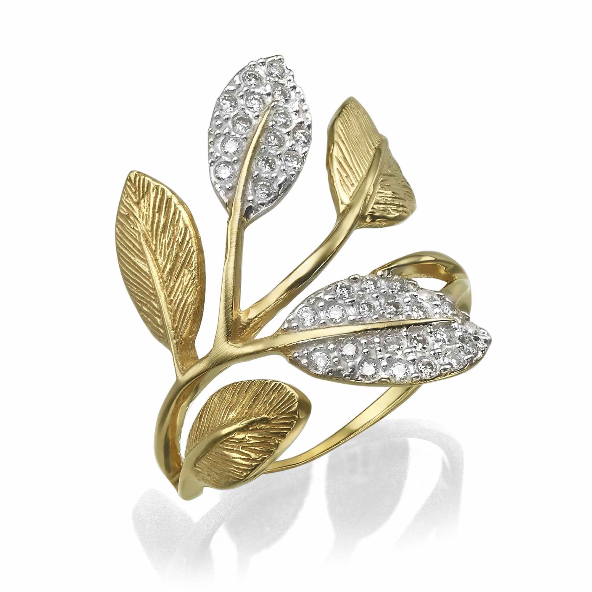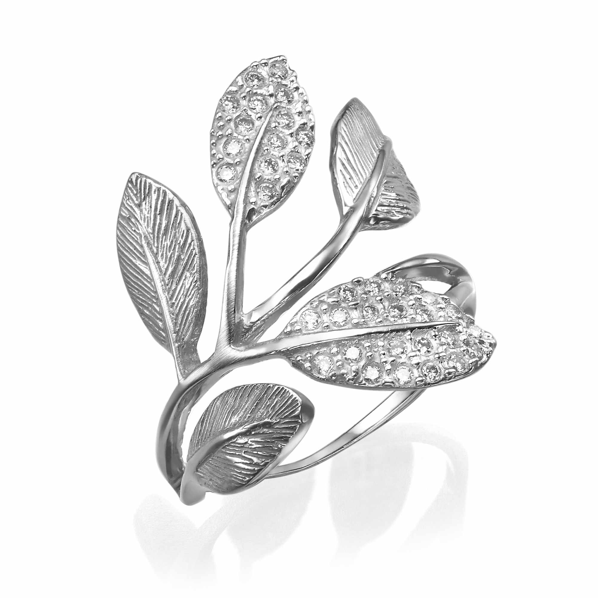 טבעת אומנותית עלים בשיבוץ אבנים קטנות